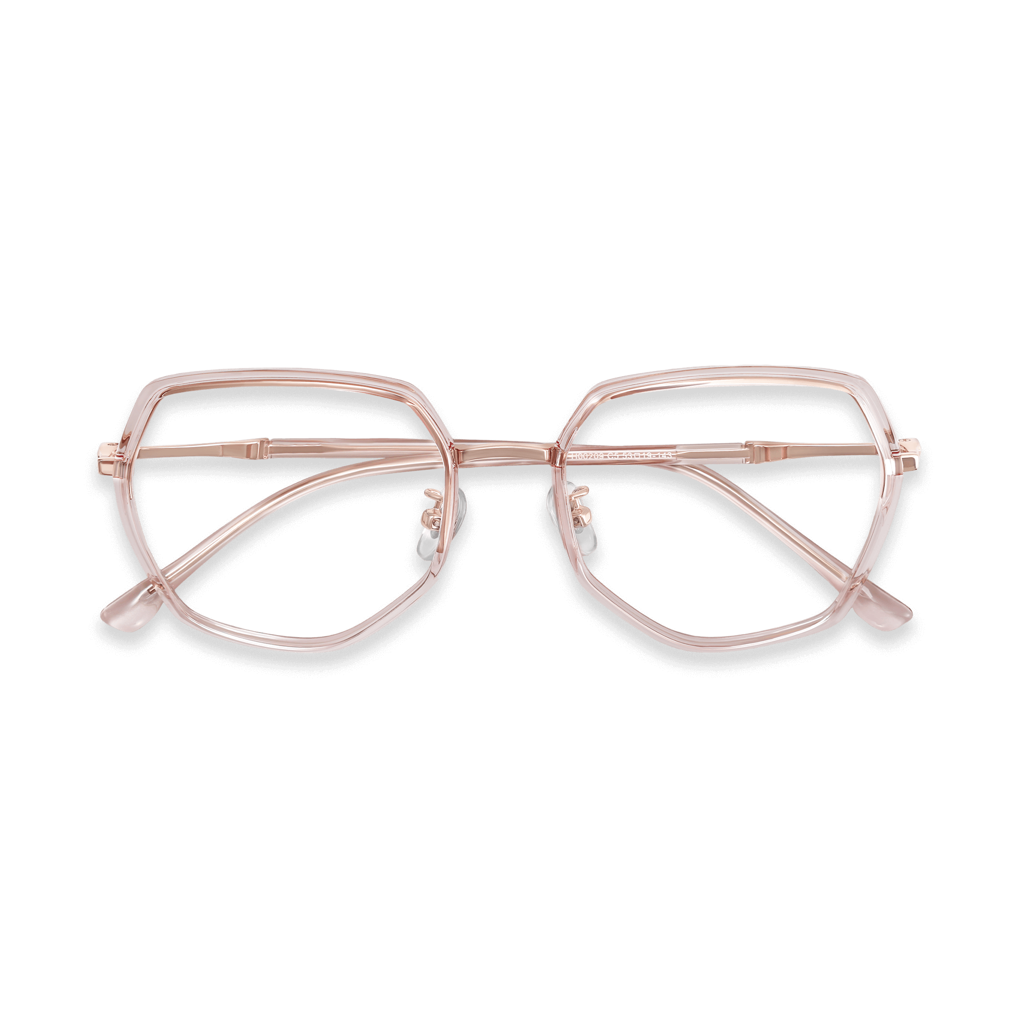 These double – bridge hexagonal eyeglasses are a harmonious blend of style and practicality. The frame is crafted from a translucent, pink – tinted plastic, giving it a trendy and feminine look. With polished metal accents on the bridge, hinges, and temple connections, they exude an elegant and modern aesthetic. The clear nose pads and curved temples ensure comfort during long – term wear.