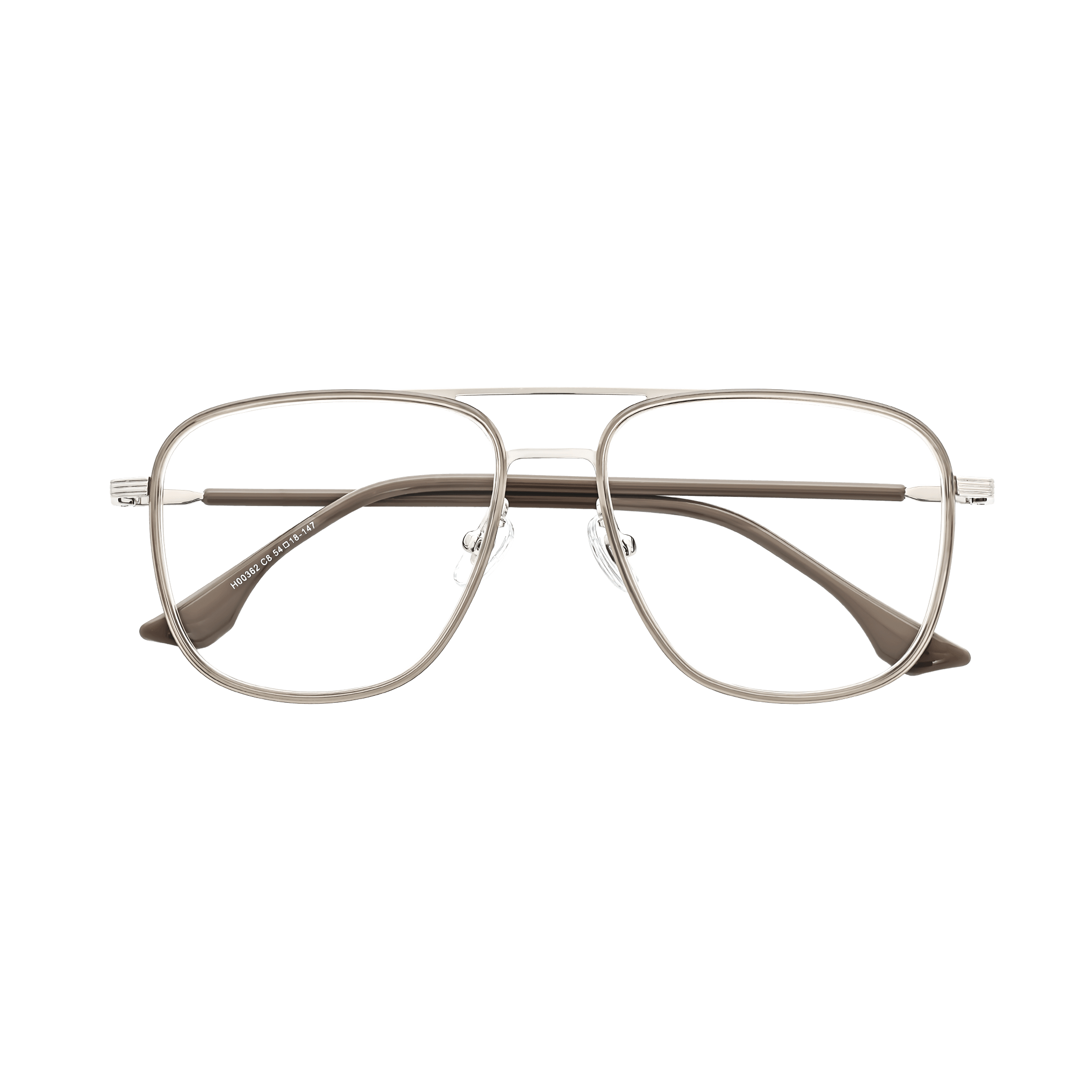 These aviator-style eyeglasses offer a harmonious blend of fashion and practicality. The frame, crafted from a lightweight metal alloy with a polished silver – gray finish, provides durability and a sleek look. The brown, flexible material on the temples and curved earpieces not only adds a stylish contrast but also ensures a comfortable and secure fit.