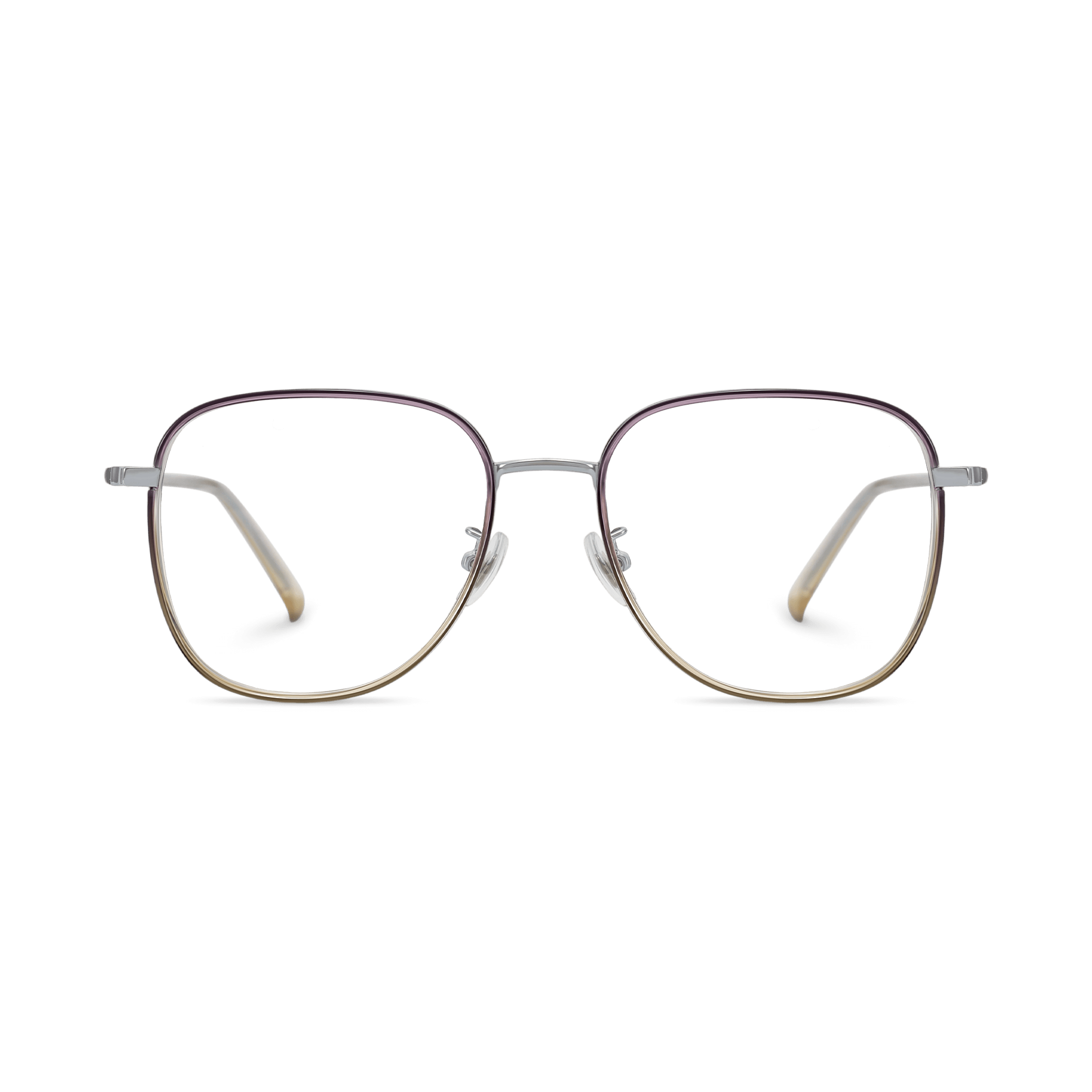 | Frame Rims | Two – tone gradient effect, transitioning from a deep purple (top/upper edges) to a light gold or champagne (bottom/lower edges), with a metallic or coated metal finish |