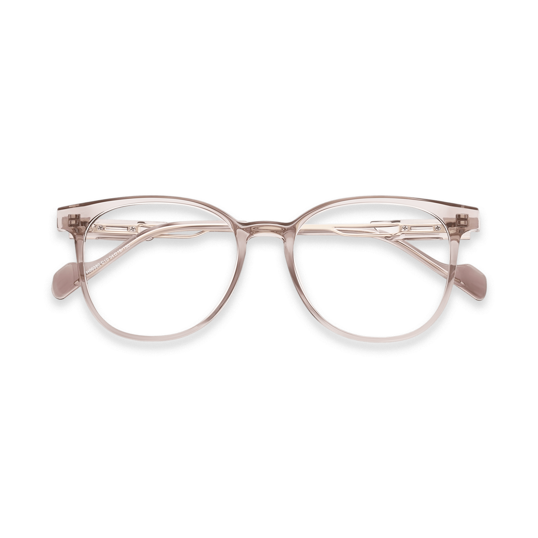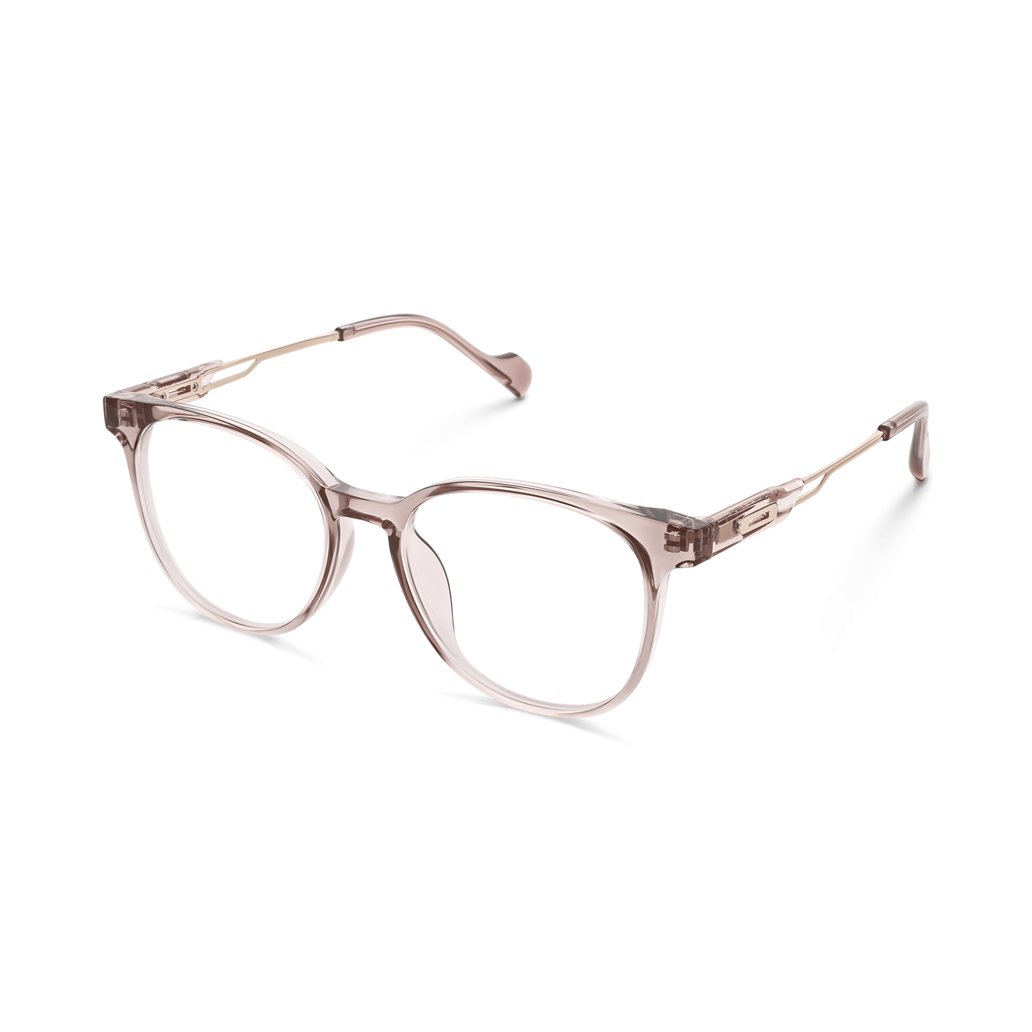 These optical eyeglasses are a harmonious blend of style and functionality. The frame, crafted from a semi – transparent, lightweight plastic in a soft, muted pinkish – gray or taupe, has a smooth and polished finish. The addition of metallic gold/rose gold accents on the temples provides a touch of elegance, while the round/oval lenses with slightly curved upper edges give it a subtle cat – eye look.