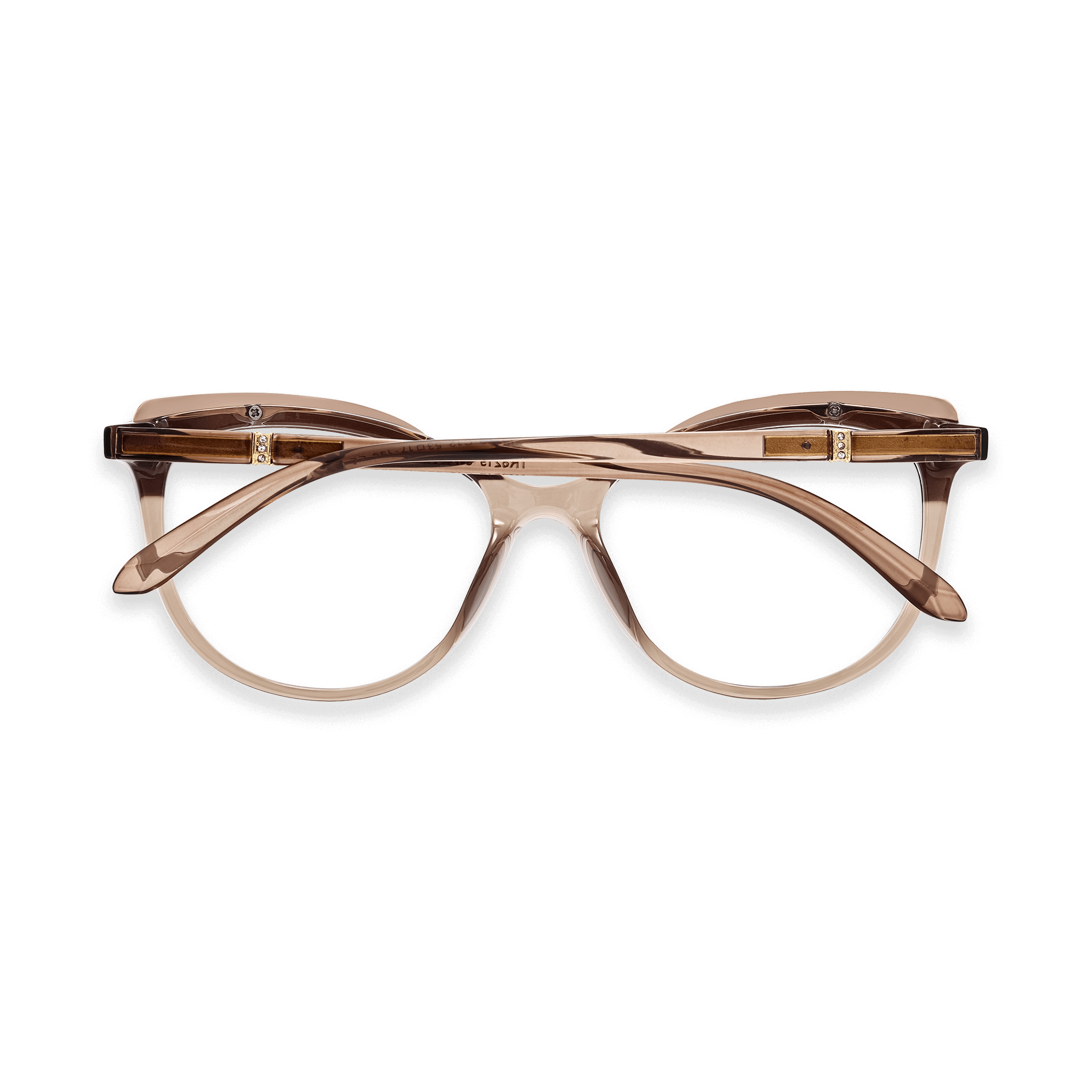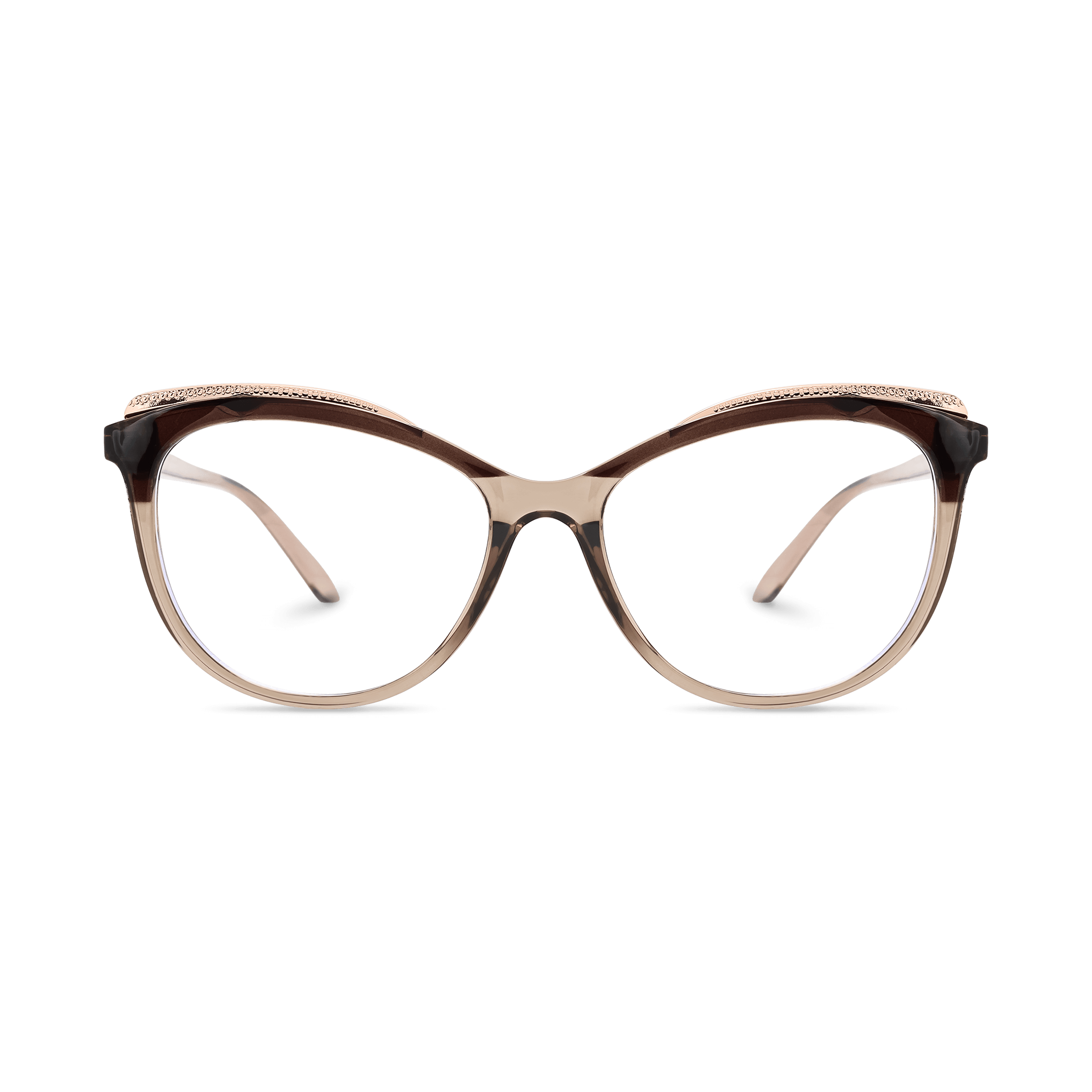 These optical eyeglasses are a perfect blend of style and functionality. The cat-eye silhouette with rounded lens bottoms offers a soft, feminine look. The frame features a gradient semi-brown finish on translucent plastic/acetate, complemented by gold/rose gold metallic accents and gem-like details for a glamorous touch.