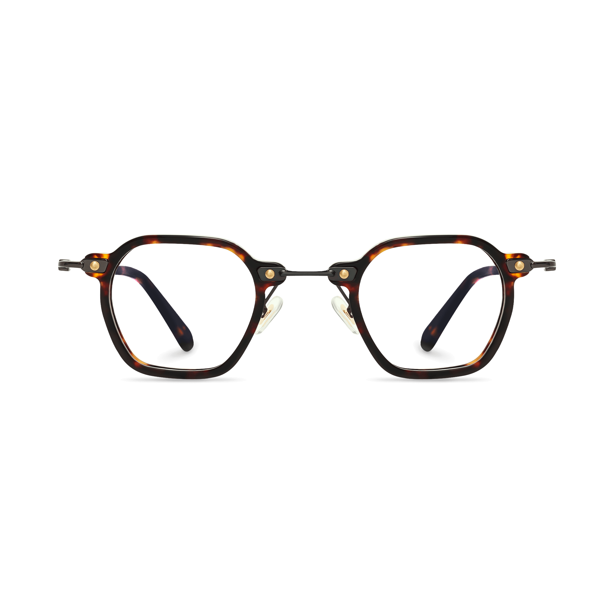 These eyeglasses are a perfect blend of classic and modern. The tortoiseshell – patterned frame, made of high – quality acetate, gives them a vintage look, while the gold accents at the hinges and temple tips add a touch of luxury. With a hexagonal shape and a balanced design, they are suitable for various face shapes and offer both style and comfort.