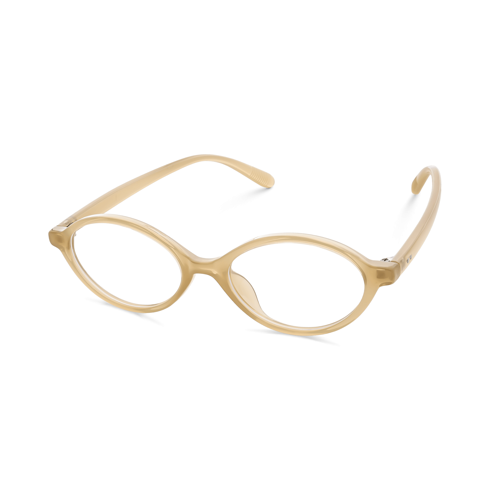 These eyeglass frames are a stylish and functional choice. Crafted from a lightweight, translucent plastic material, they feature an oval lens shape with a continuous, curved silhouette. The light, muted beige/amber color gives them a unique and fashionable look, suitable for both vision correction and as an accessory.