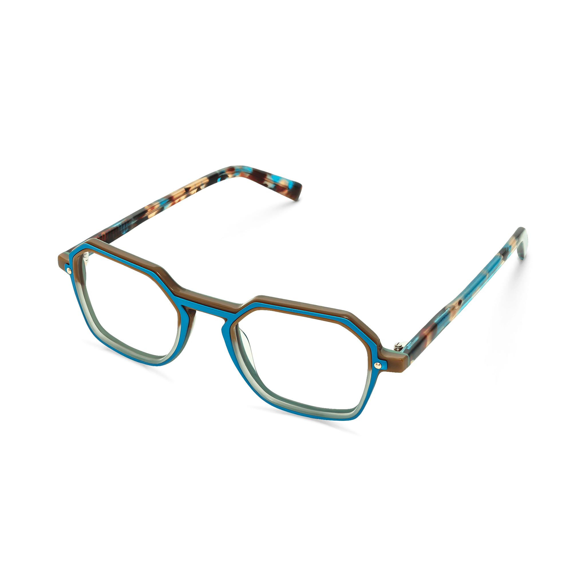 These eyeglasses are a stylish and functional choice. The frame front, made of a likely plastic or acetate material, has a smooth finish and a unique dual – tone design with a blue gradient transitioning to a lighter blue or teal on the outer edge and a brown inner frame. The tortoiseshell – patterned temples and gold – toned screws add to their overall aesthetic appeal, making them suitable for both vision correction and as a fashionable accessory.
