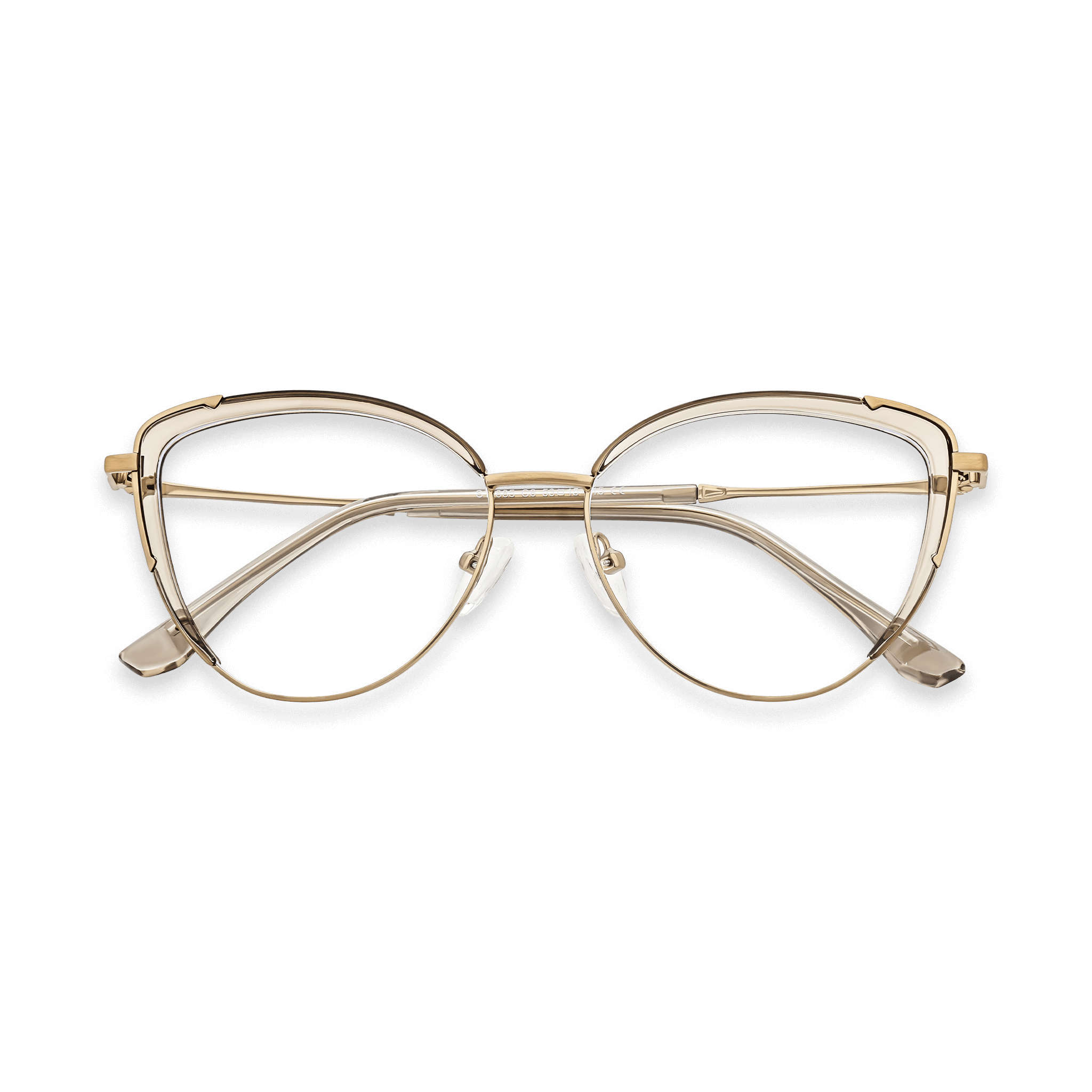 These dual – material cat – eye eyeglasses are a perfect blend of fashion and functionality. The frame combines translucent plastic upper sections in a light champagne or beige tint with gold – toned metal lower parts and temples. With a cat – eye design, they offer a vintage – modern look, suitable for both prescription and non – prescription use.