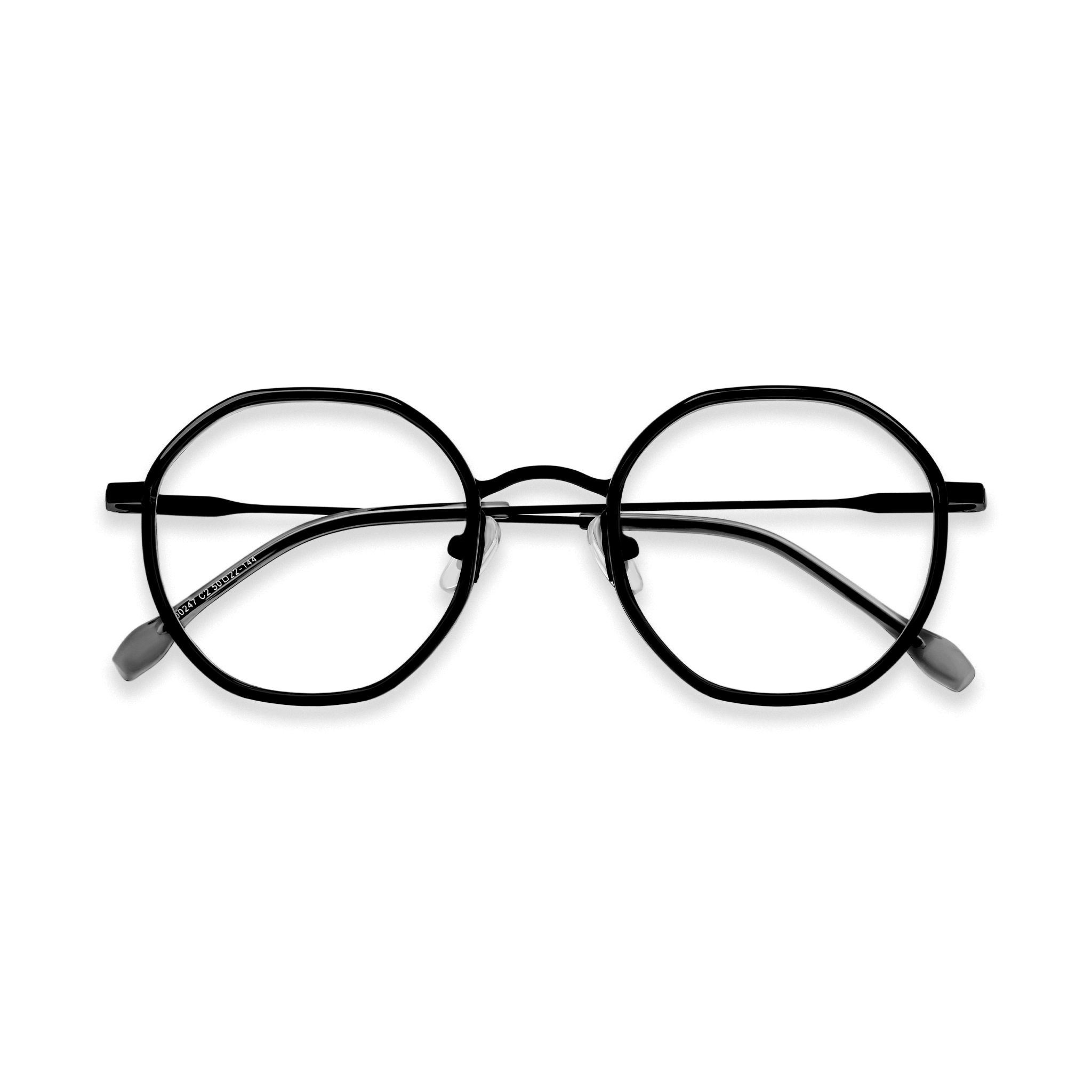 These eyeglasses are a harmonious blend of style and practicality. The frames are crafted from a likely alloy of metal, featuring a smooth, polished black finish that gives them a sleek and modern look. With a round lens shape having a slightly angular outer edge, they present a trendy, retro – modern aesthetic suitable for various occasions.