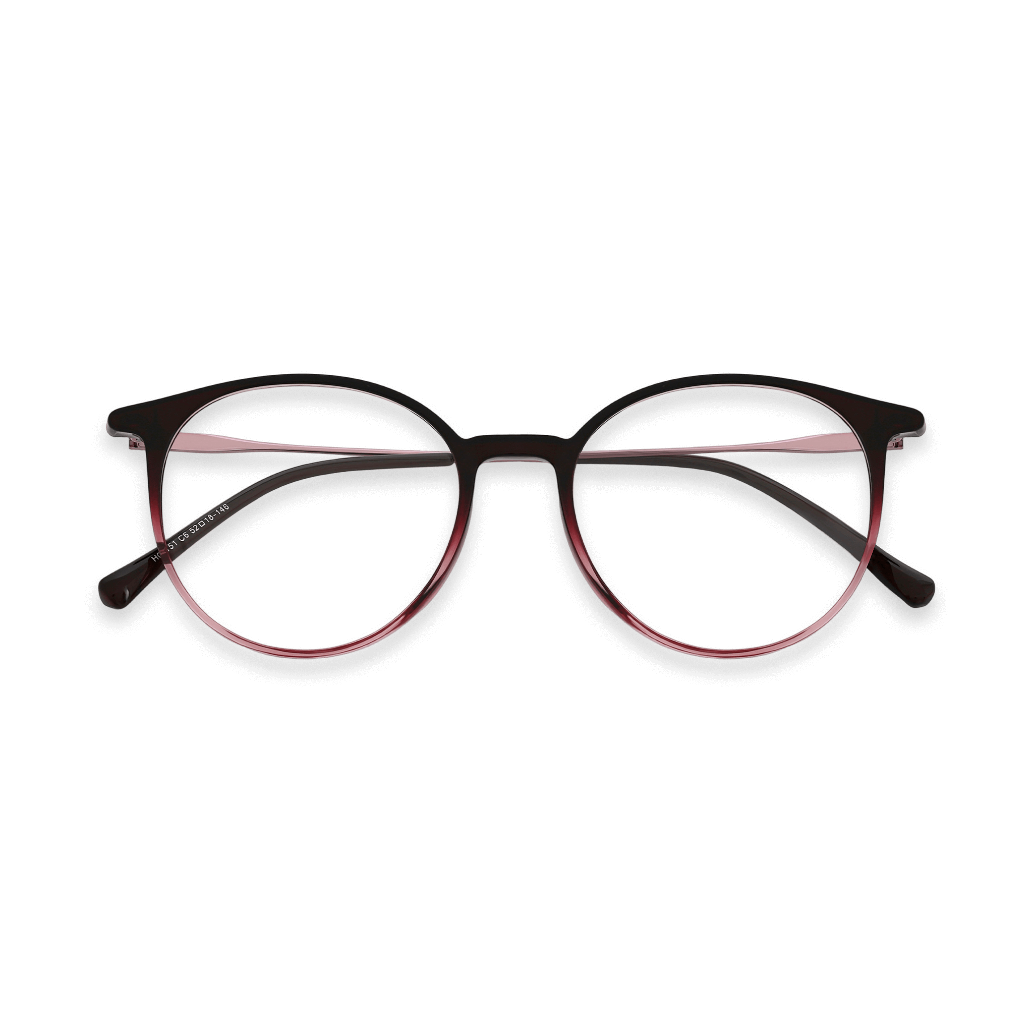 These eyeglasses are a harmonious blend of style and functionality. With a round shape and a subtle cat-eye curve, they offer a modern and minimalist aesthetic. The frame is made of a lightweight, durable plastic or acetate material, featuring a gradient color transition from deep maroon – brown to a lighter pink, along with black ear tips for contrast and grip.