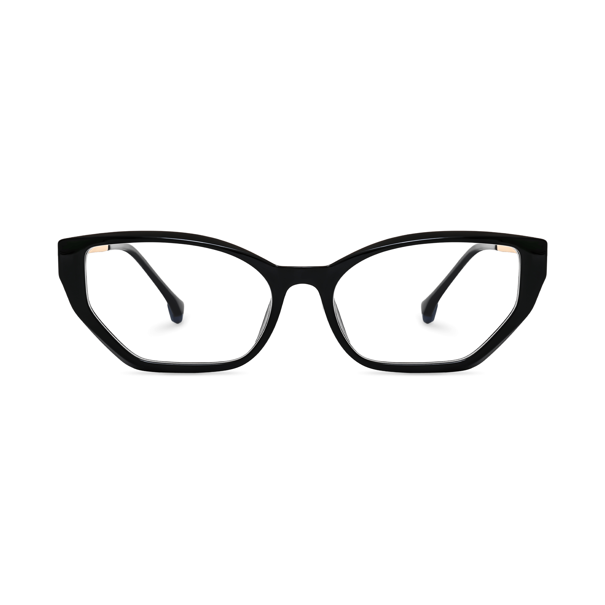 These eyeglasses are a harmonious blend of style and functionality. The frame front is crafted from glossy black plastic/acetate, offering a polished finish and durability. The temples feature a metallic gold section and dark blue/black silicone ear tips, adding both elegance and comfort. They are suitable for vision correction and make a bold fashion statement.