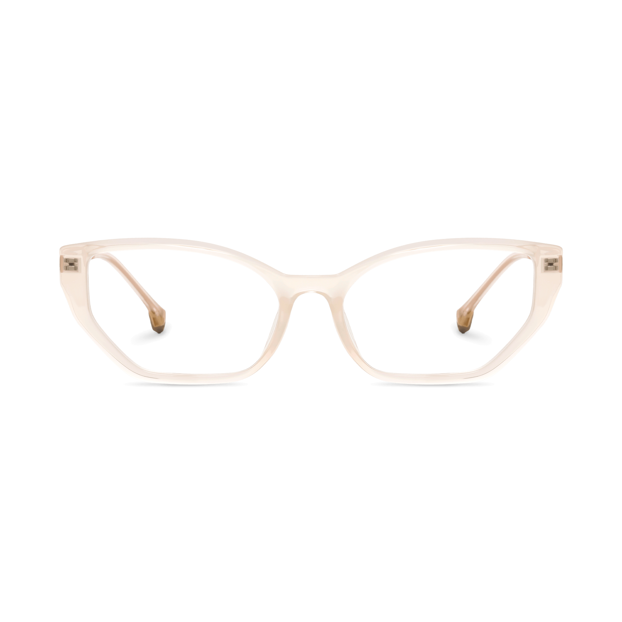 These optical eyeglasses offer a blend of style and functionality. The cat-eye inspired design with a geometric lens outline and clean, symmetrical lines gives them a modern, minimalist look. The combination of a translucent light beige plastic frame and metallic gold temples creates an elegant and fashionable appearance, suitable for various occasions.