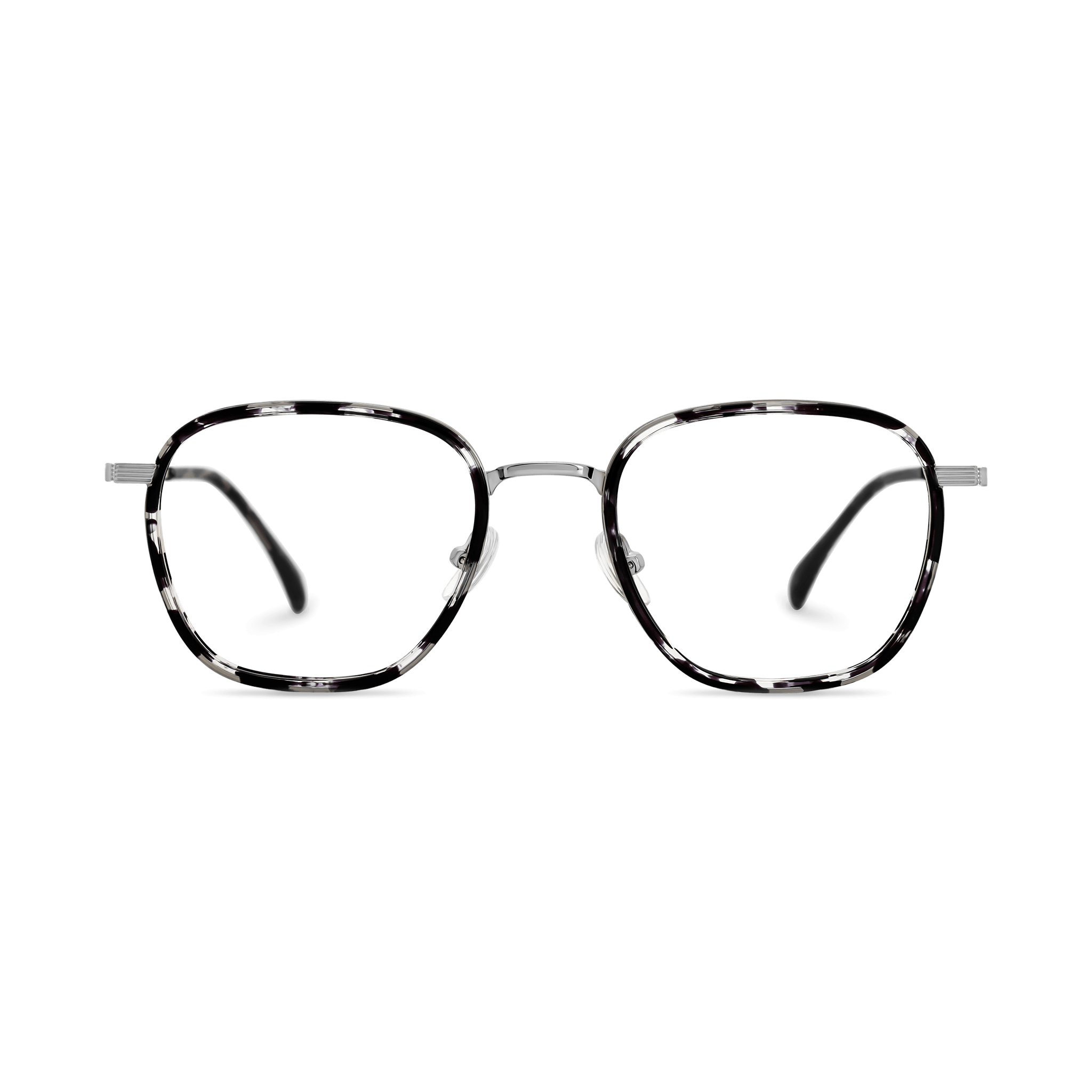 These eyeglasses are a harmonious blend of style and function. The lens rims have a classic tortoiseshell pattern in black and white, while the temples and bridge feature a silver/metallic gray finish. The square-to-round shape of the lenses offers a modern yet approachable look, making them suitable for a variety of occasions.