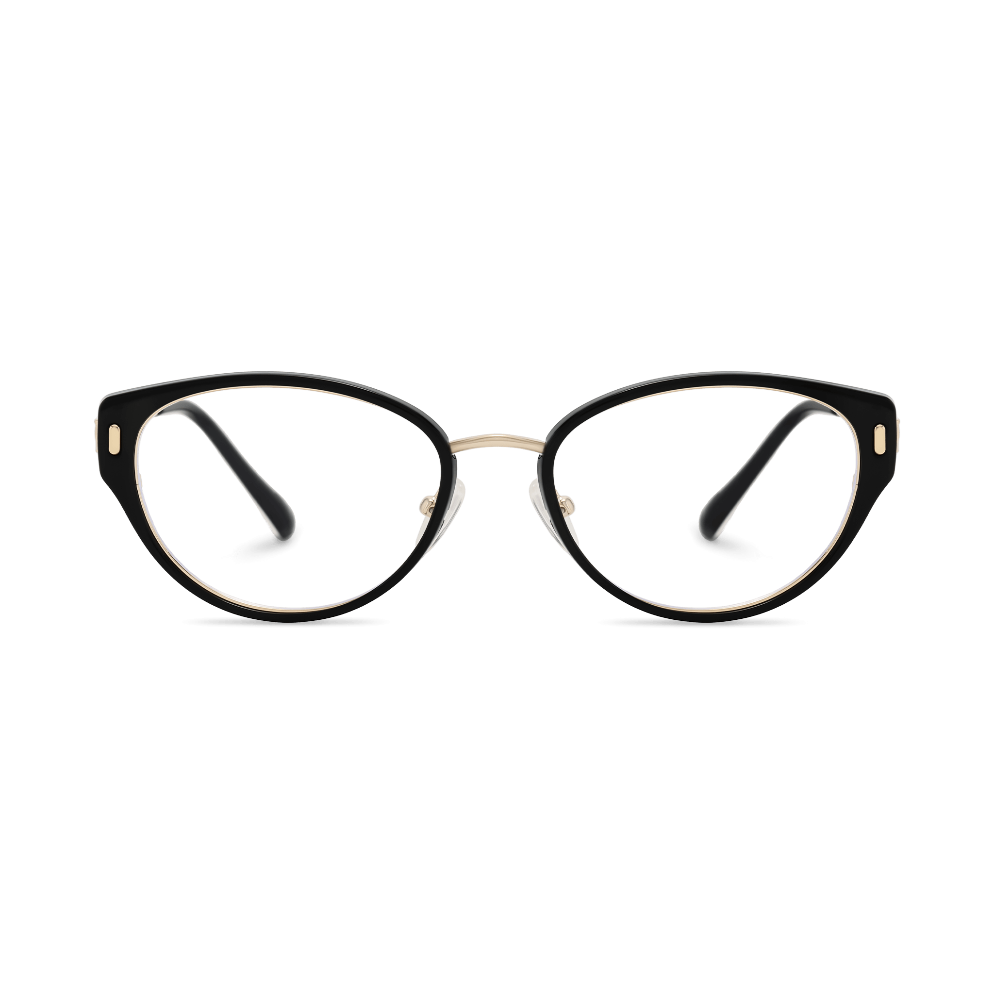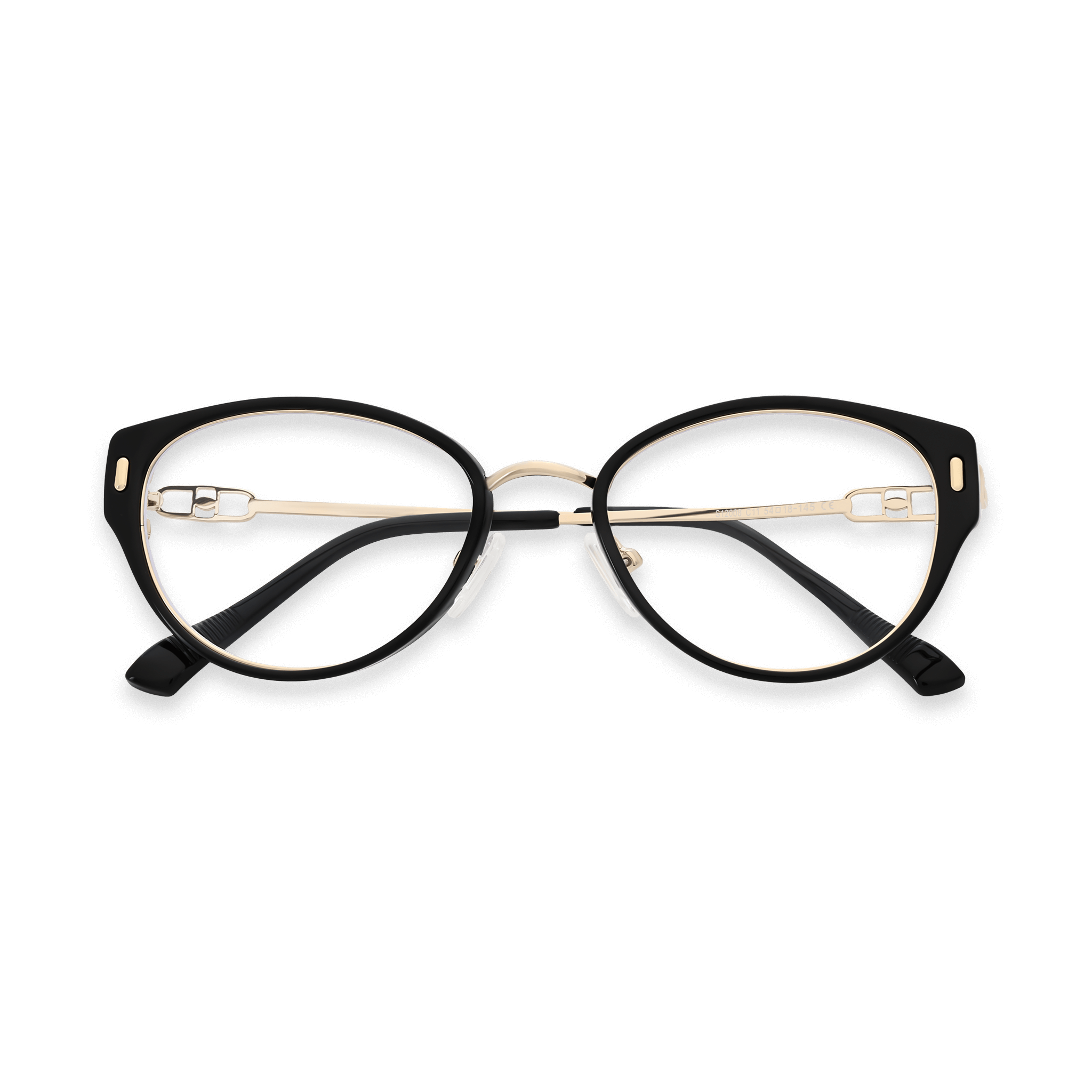 These eyeglasses are a harmonious blend of style and practicality. The frame is crafted from smooth, black acetate or high – quality plastic, paired with gold – toned metallic accents on the bridge, temple arms, and decorative links. The cat – eye shape offers a retro – inspired, feminine look, while the clear lenses make them suitable for vision correction.