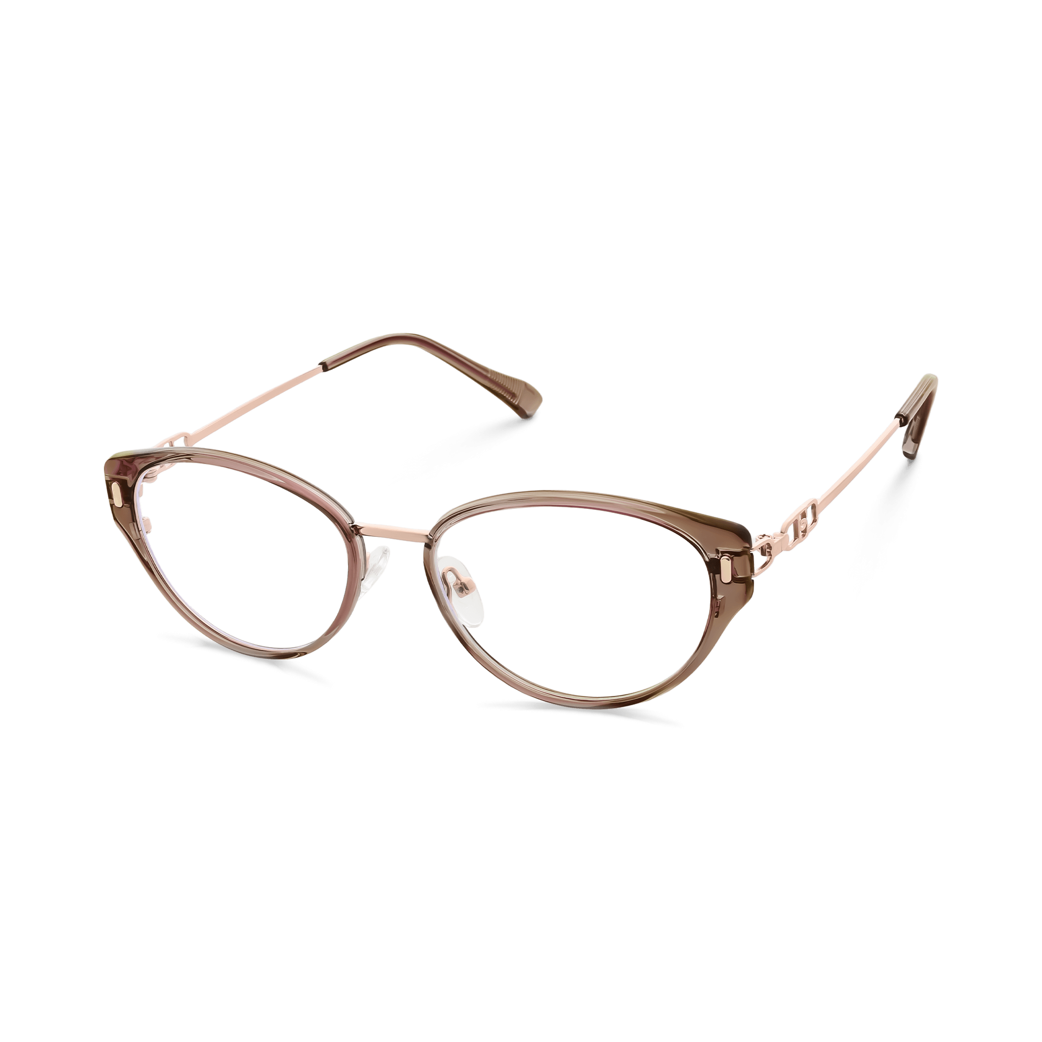 These optical eyeglasses are a harmonious blend of style and function. The frame front is crafted from a translucent, gradient brown plastic/acetate material, while the bridge and temple hinges feature a rose – gold metallic alloy. The cat – eye silhouette gives it a vintage and feminine look, making it suitable for both vision correction and as a fashion statement.