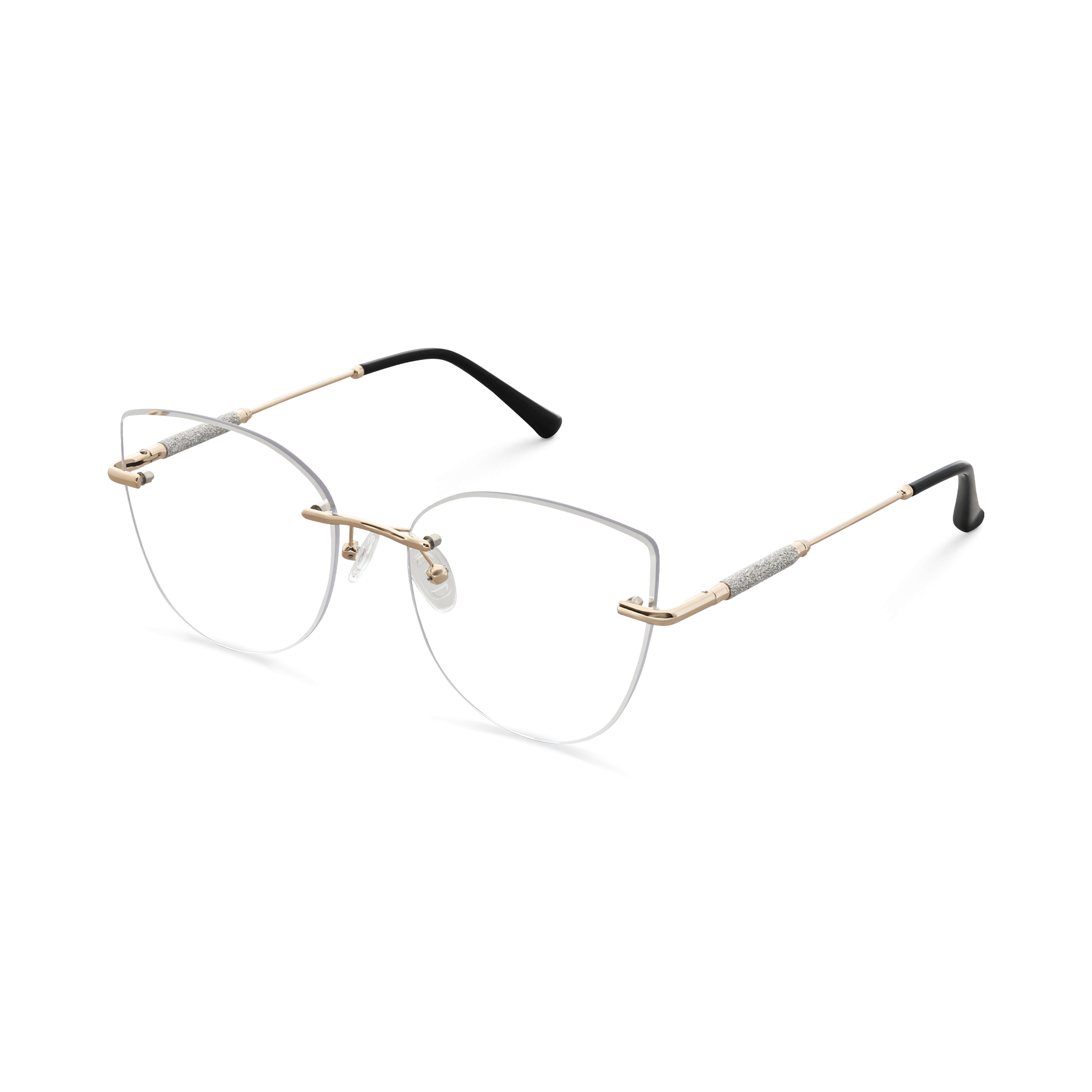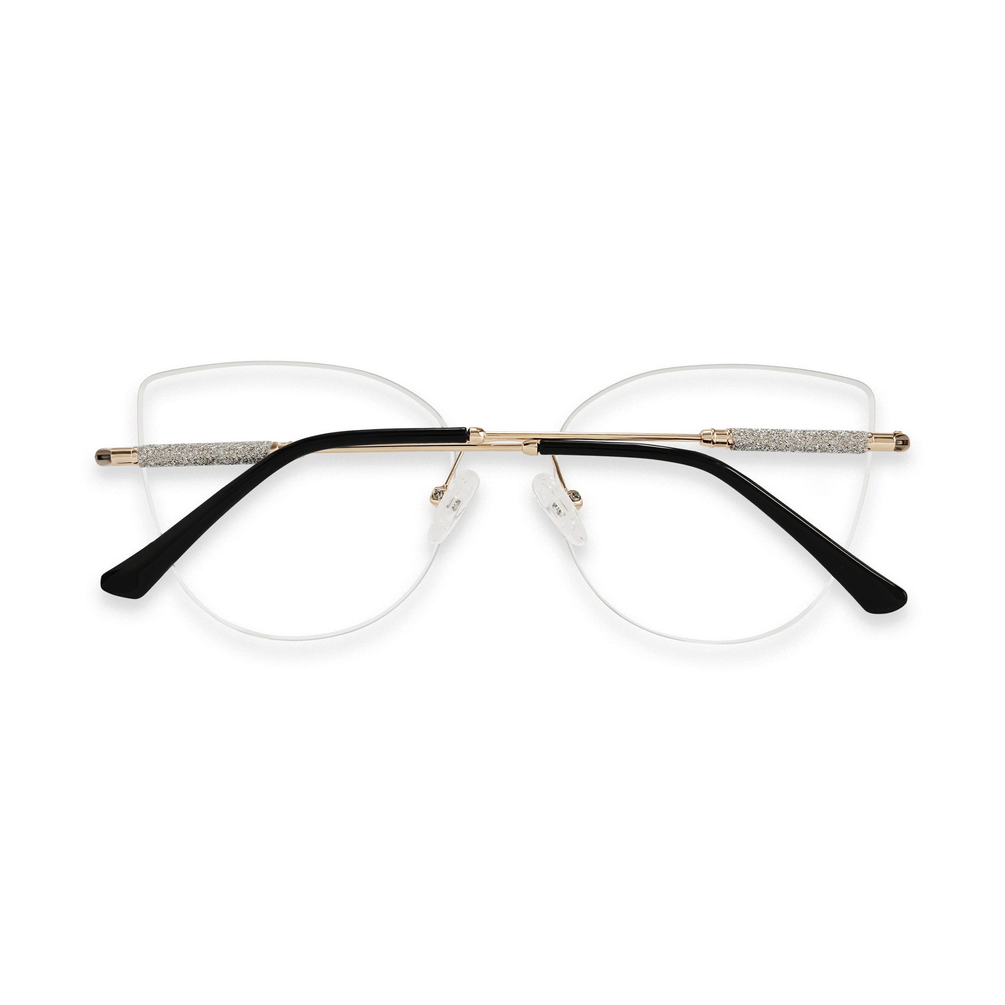These eyeglasses are a harmonious blend of style and functionality. The frame showcases a modern cat – eye or butterfly – style design with a semi – rimless/rimless front, offering a light and delicate look. The gold – toned metal parts paired with black ergonomic temple tips and sparkly temple sections add a touch of luxury, making them suitable for various occasions.