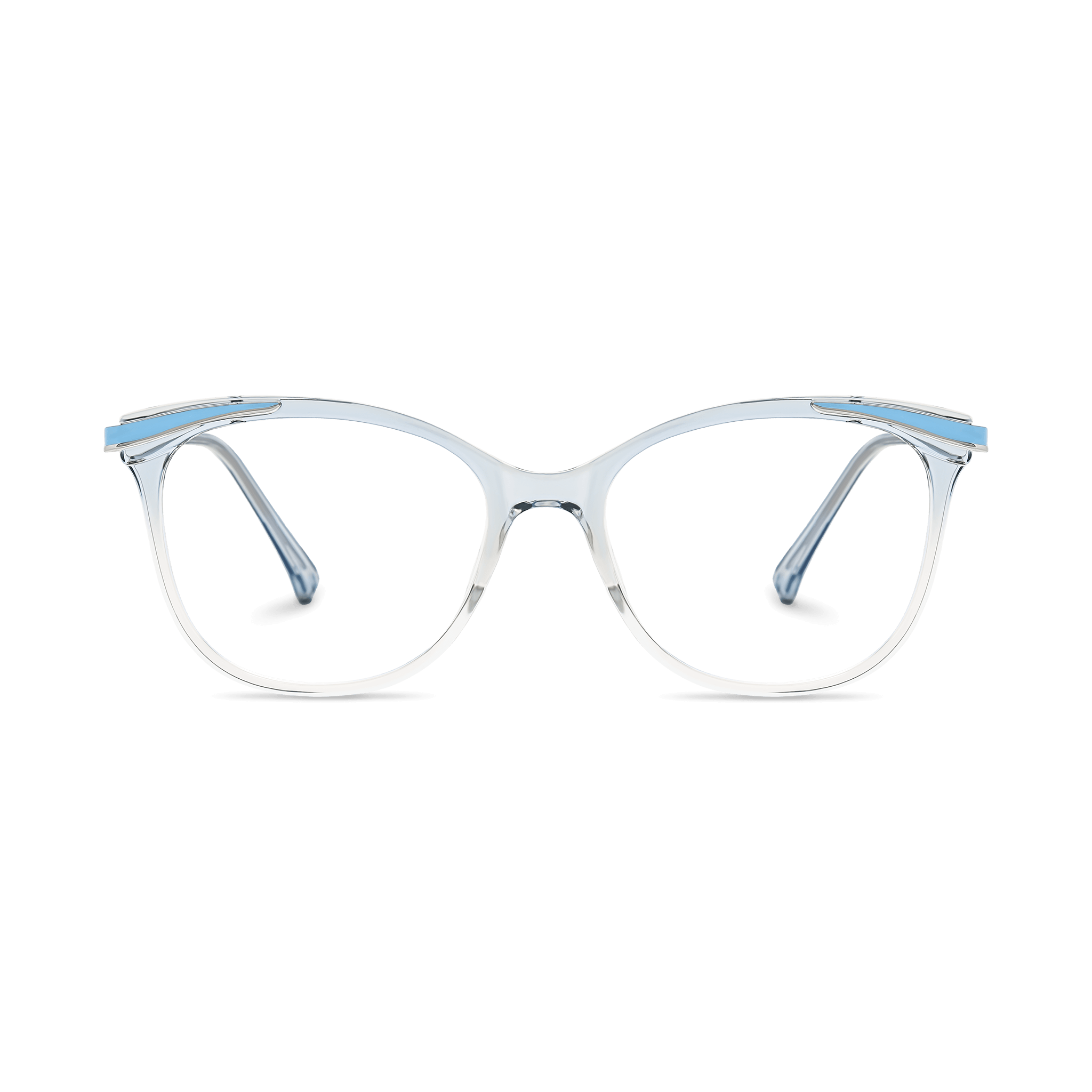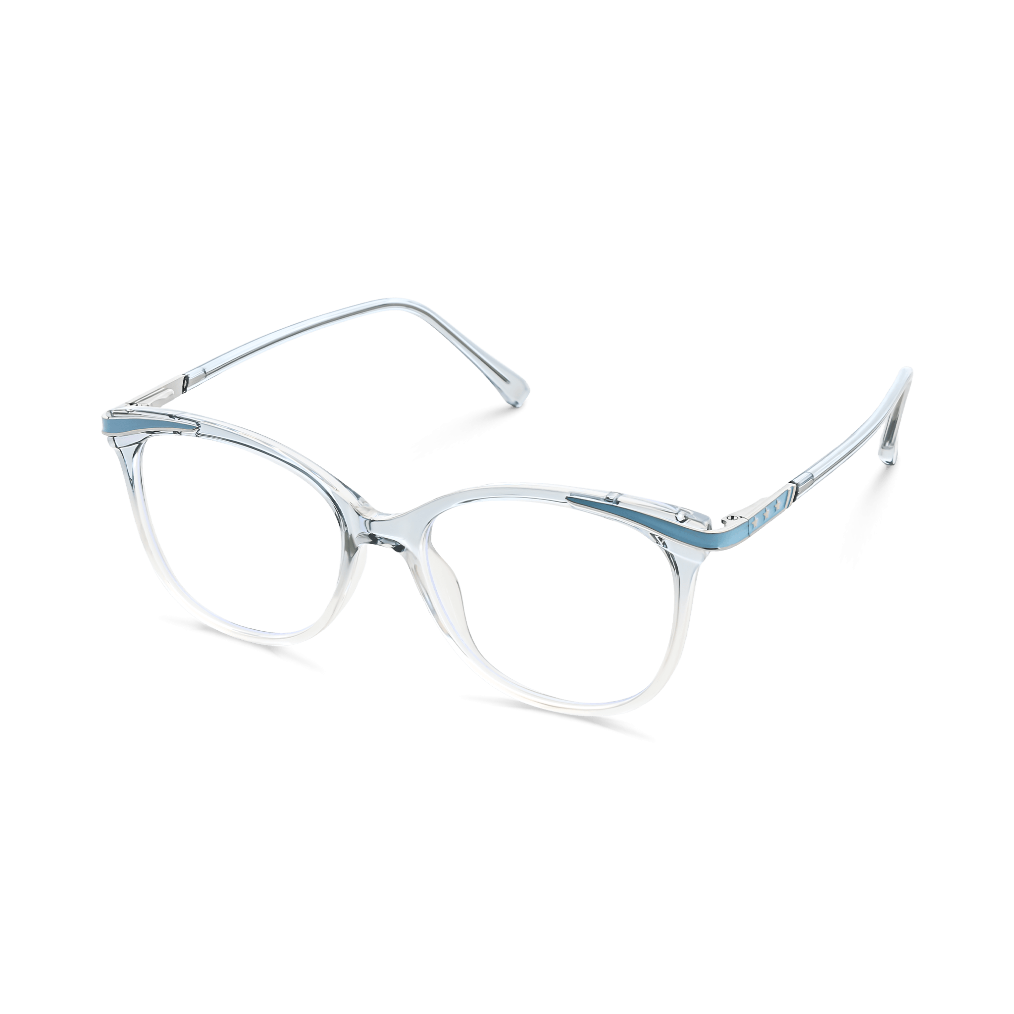 These optical eyeglass frames offer a seamless blend of fashion and functionality. With a contemporary cat – eye silhouette, they feature a clear/translucent plastic front that gives a modern, airy look. The metallic temples and bright blue accents add a touch of sophistication and style, making them suitable for various occasions.