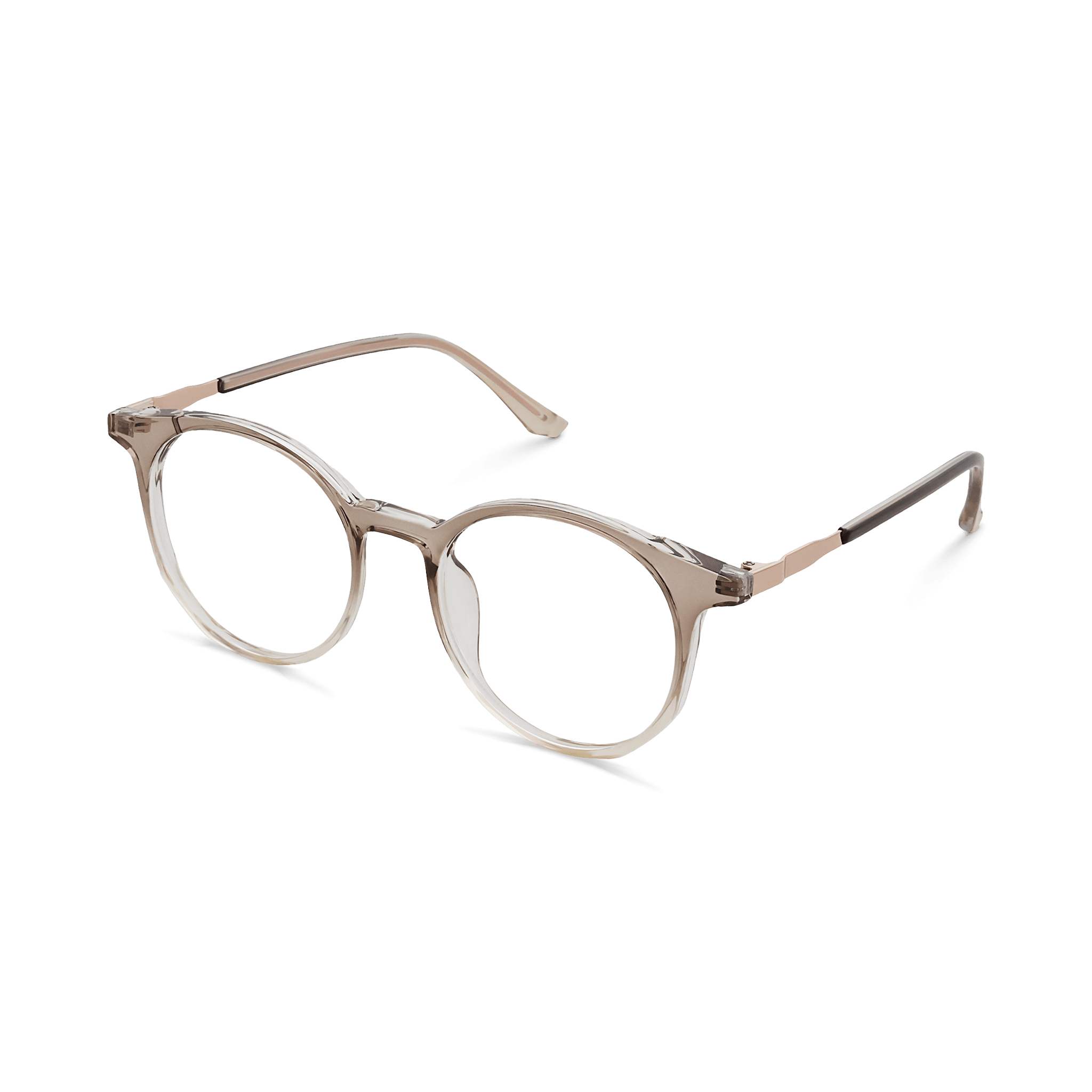 These eyeglasses are a harmonious blend of functionality and style. The frames, crafted from high – quality translucent plastic, showcase a gradient taupe – to – transparent finish, which adds a sophisticated touch. The combination of the rounded, subtly cat – eye inspired lenses and metallic accents on the temples creates a modern and versatile look suitable for various occasions.